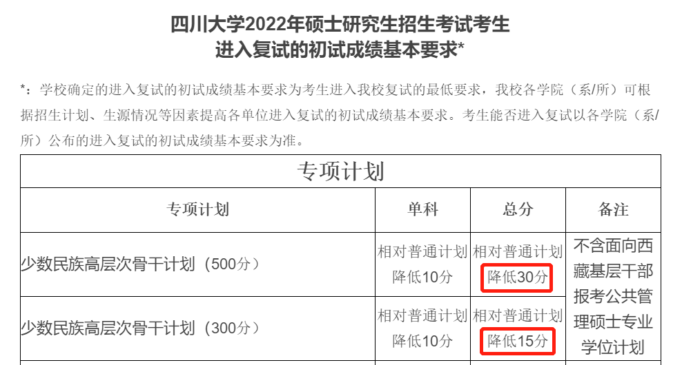 例如四川大学2022年对少干计划的复试成绩要求,管理类专硕总分要求可以降低15分,经济类等满分500分的专业总分要求可以降低30分!