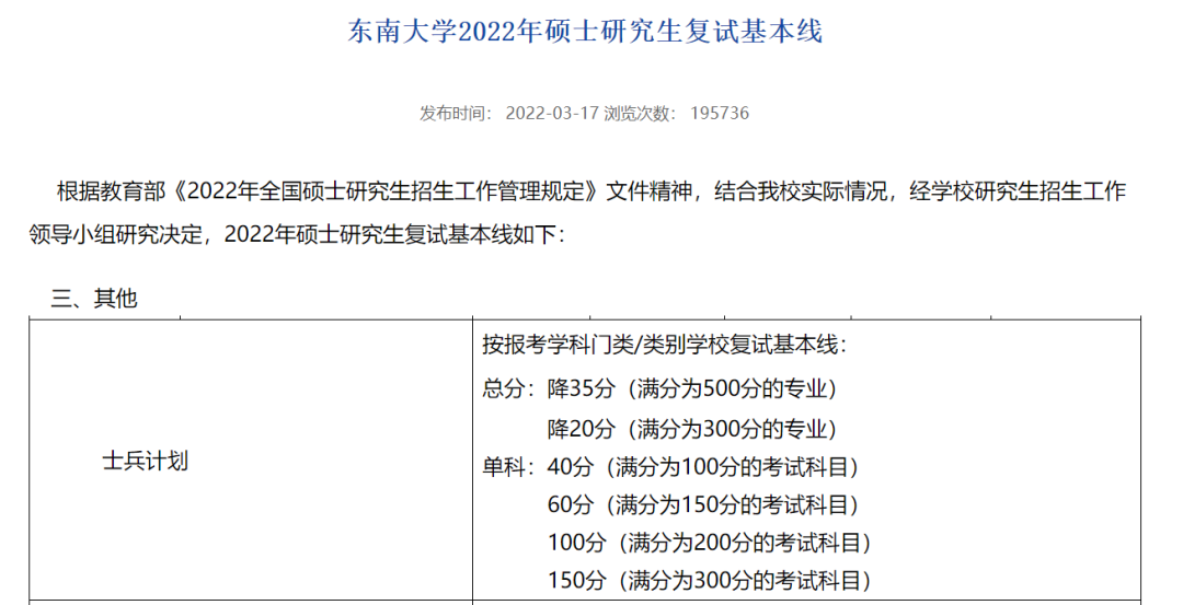 类似少干计划,士兵计划考生也能够获得降低考研复试分数线总分及单科分的照顾,降分幅度因学校而异。例如东南大学2022年士兵计划复试分数管理类专硕总分可以降低20分,经济类等硕士总分可以降低35分。