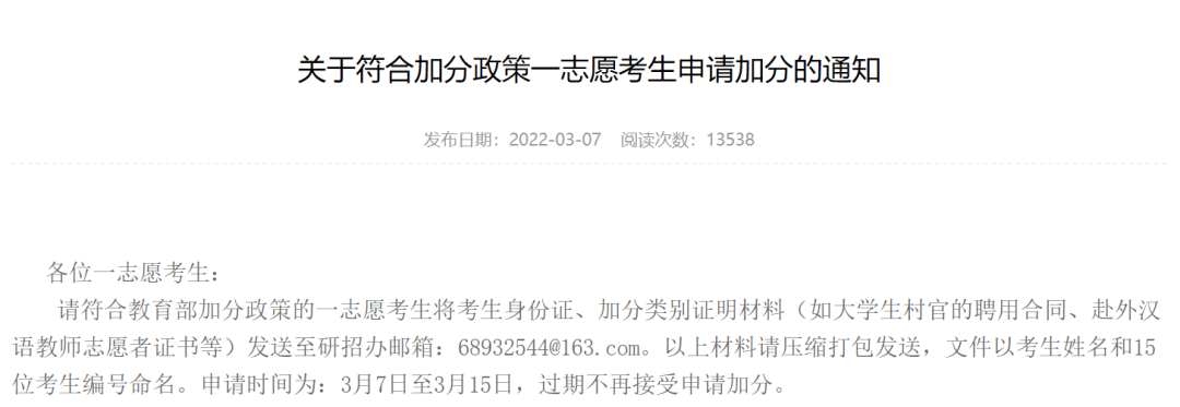 1. 参加“大学生志愿服务西部计划”“三支一扶计划”“农村义务教育阶段学校教师特设岗位计划”“赴外汉语教师志愿者”等项目服务期满、考核合格的考生,3年内参加全国硕士研究生招生考试的,初试总分加10分,同等条件下优先录取。