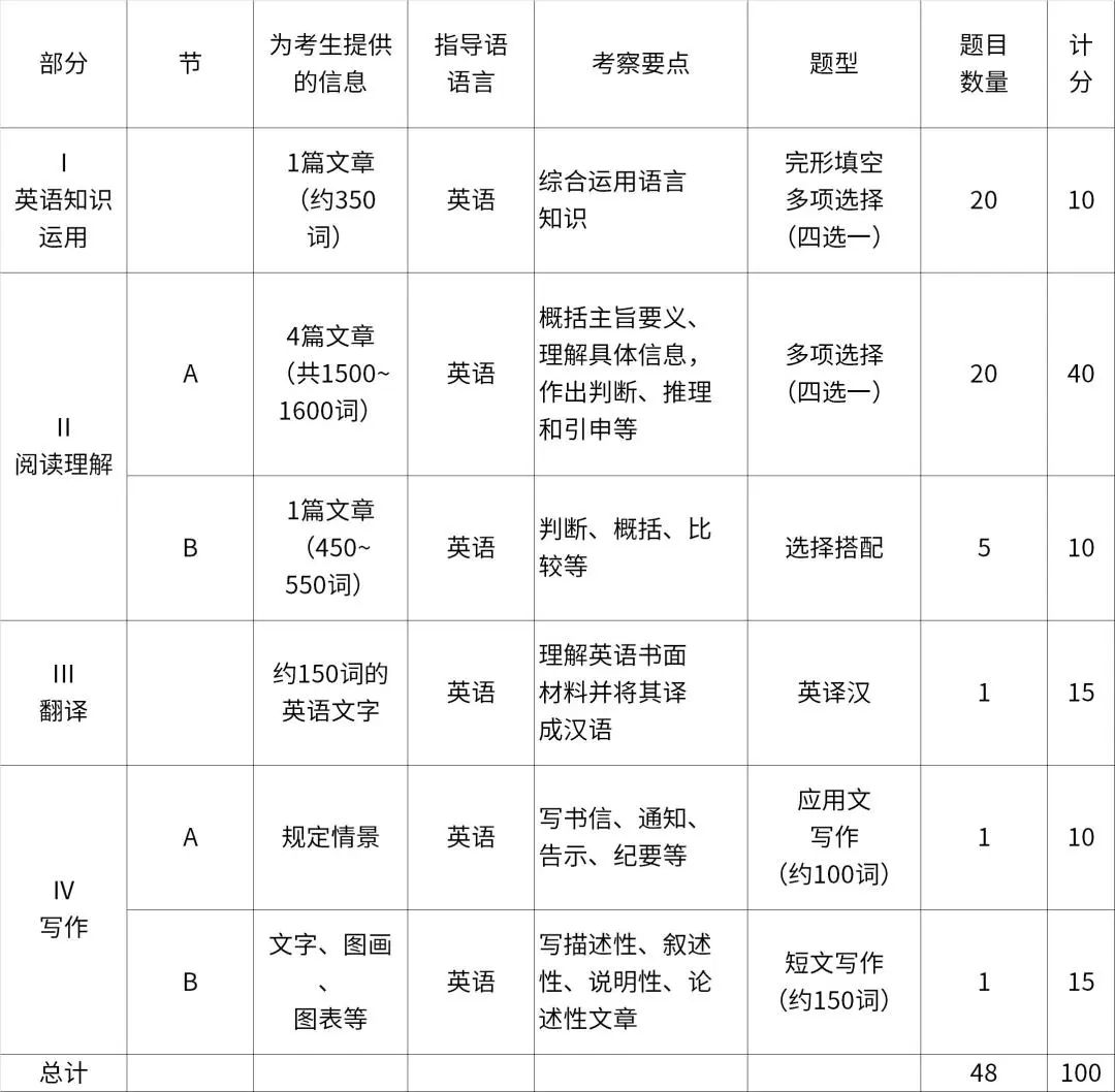 试题分四部分,包括英语知识运用、阅读理解、翻译和写作,共48小题。