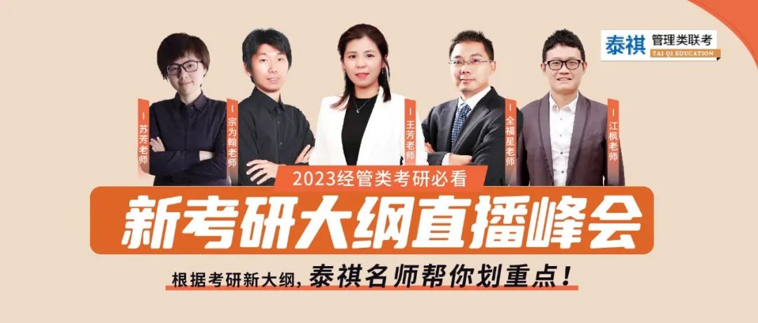 近日,2023年全国硕士研究生招生考试大纲已公布。今年最新的管理类专业招生考试大纲,有哪些变化,该如何应对呢?泰祺教育集团总裁、教学教务总监王芳老师邀请泰祺教育数学教研组组长全福星老师、逻辑教研组组长宗为翰老师、语文写作教研组组长苏芳老师、英语教研组组长江枫老师,于9月22日晚,通过视频号直播的形式给大家作了详细解析!