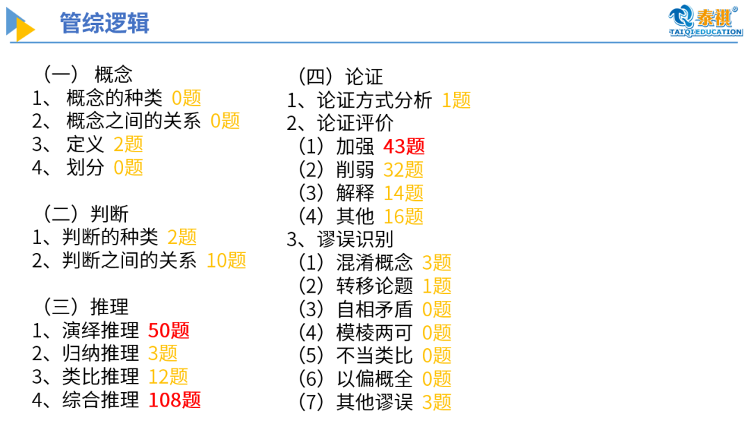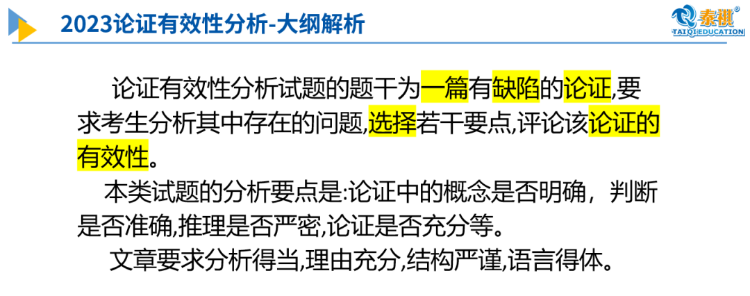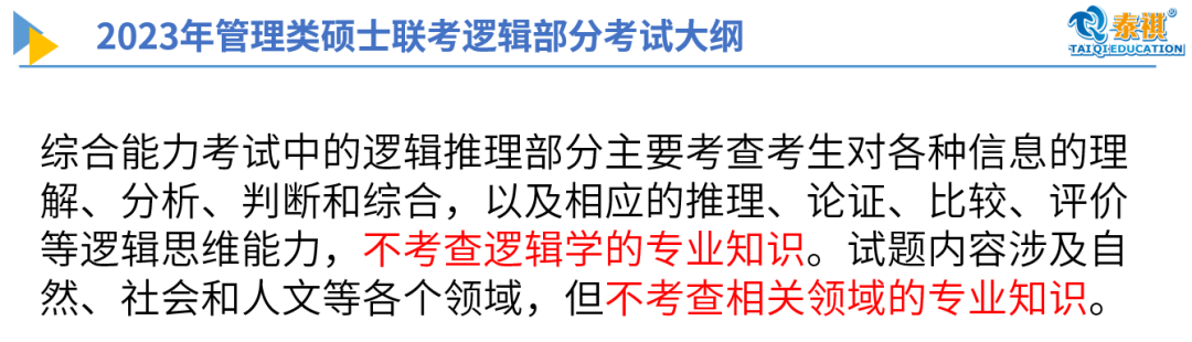 泰祺教育逻辑教研组组长宗为翰老师指出,2023年管综逻辑部分的考试大纲跟以前相比没任何变化,对大家的复习没有影响,按既定的方式复习即可。他带领大家一起解读逻辑大纲中的重点部分。