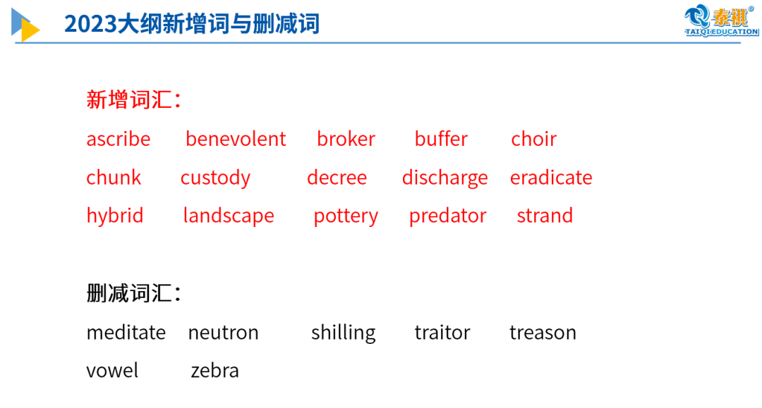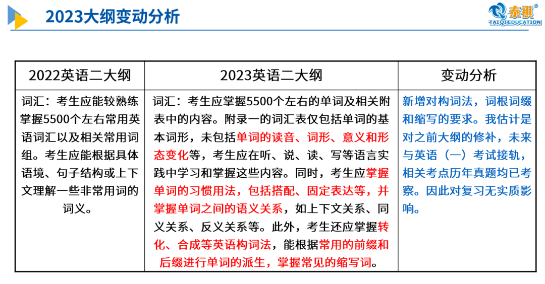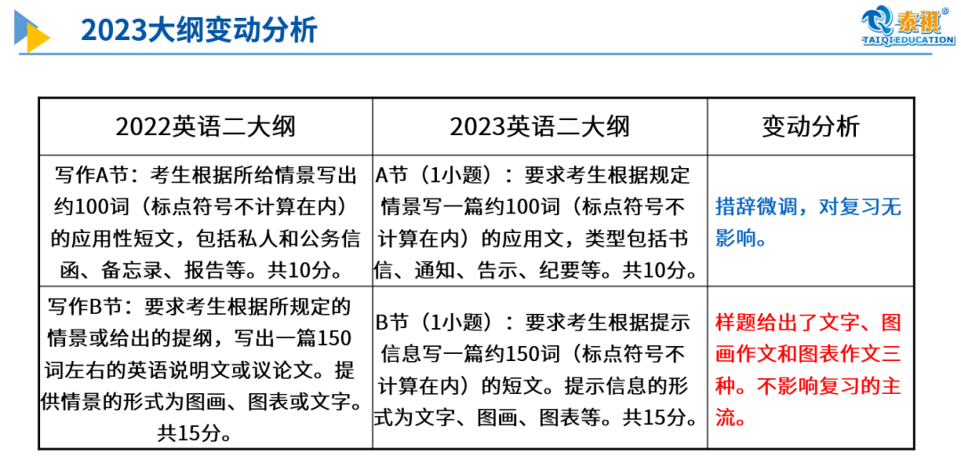 泰祺教育英语教研组组长江枫老师指出,2023年英语(二)考试大纲对比往年有几个比较显著的变化。