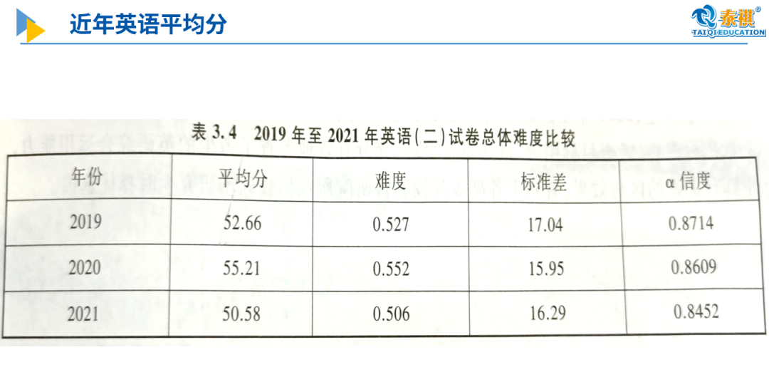 对于2019-2021年英语(二)试卷总体难度,可以看到平均分在下降。2021年难度较大,预计2023年英语(二)题目不会比2022年更难,也不会更简单。建议同学们至少吃透近五年的真题,如果有时间最好吃透近十年真题。