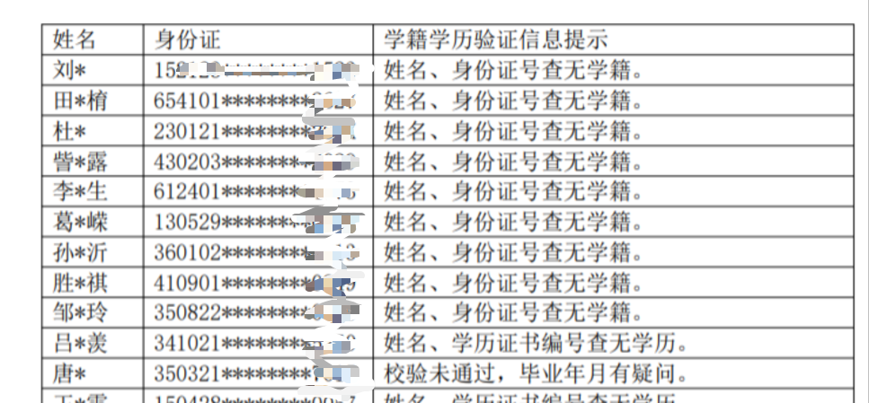 姓名、证件号码、毕业学校、毕业年月、学历层次、学历证书编号、学习形式等信息填写不正确;