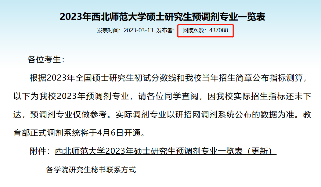 自从国家线公布以后,不少同学就在焦虑地等待院校复试线,调剂党更是急切地关注着哪些院校接受调剂。西北师范大学预调剂专业公布两天不到就有43W+的浏览量,可见调剂竞争激烈程度!