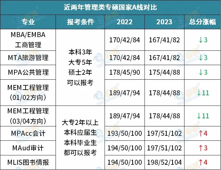而MPAcc/MAud/MLIS这几个专业,以本科应届生人群报考为主,一方面报考人数非常多;另一方面考生备考比较充分,相对弃考率不会像在职人员那么高;再加上今年管综数学和英语二难度不高,而且部分省份管综主观题得分高,所以分数线出现了小幅上涨。