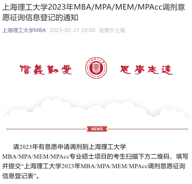 一般来说院校官网或官微会发布调剂通知,这也是最权威最及时的调剂信息。比如上海理工大学发布了2023年MBA/MPA/MEM/MPAcc调剂意愿征询信息登记通知: