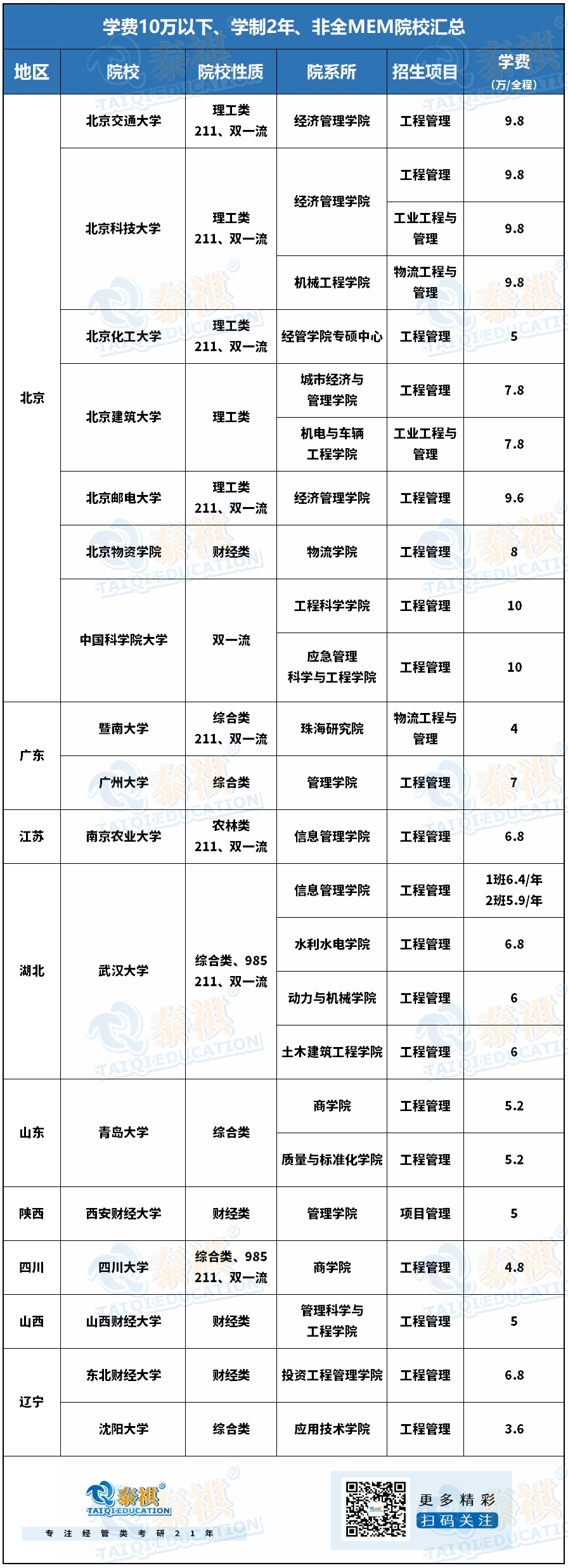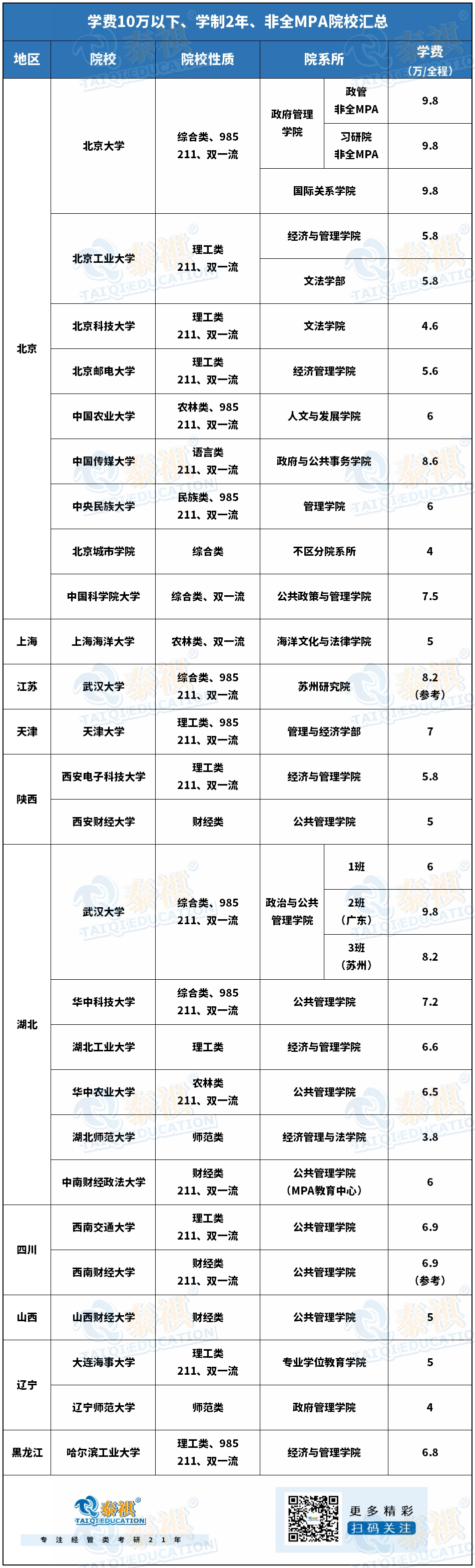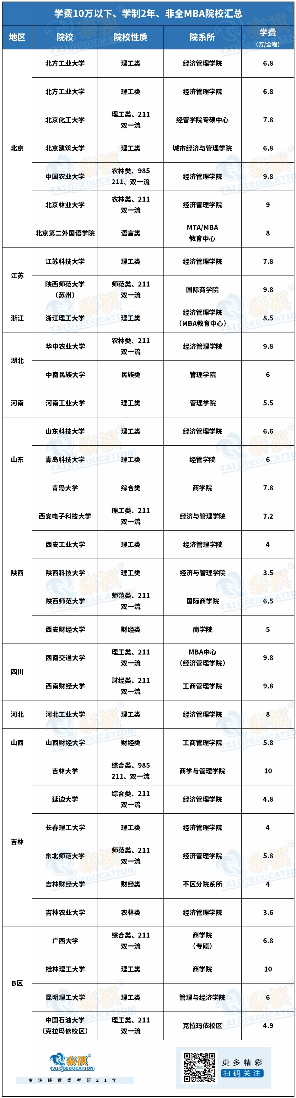 所以,今天这篇文章就为大家汇总了全国各省市适合在职人员报考的、学费10万及以下且学制2年的管理类专硕,包括MBA、MPA、MEM、MPAcc四大专业,看看有没有你心仪的院校吧~