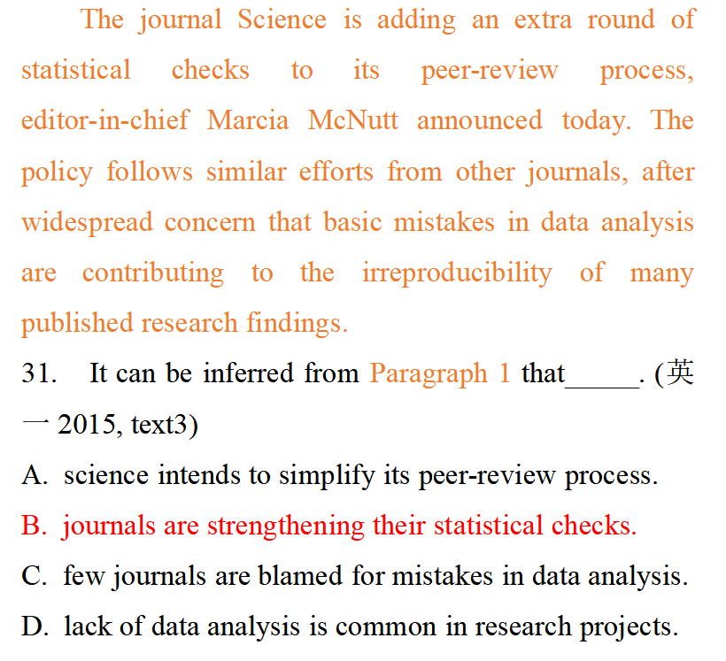 第一段说The policy follows similar efforts from other journals(该政策得到其他期刊类似的努力)the policy指第一句The journal Science is adding an extra round of statistical checks to its peer-review process(科学杂志把统计检查额外添加到它的同行评审过程中。