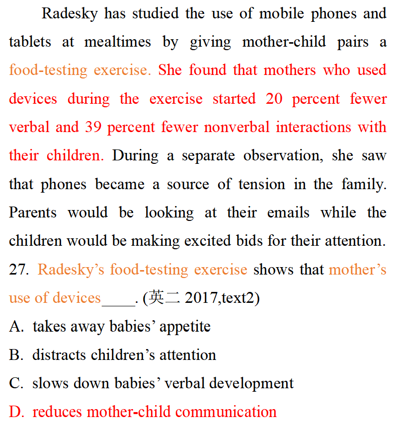 将观点与选项对比,确定正确答案。注意审题,同时注意排除只谈论例子本身而不谈及观点的选项。比对选项发现D. reduces mother-child communication和该句意思符合。所以正确选项为D。