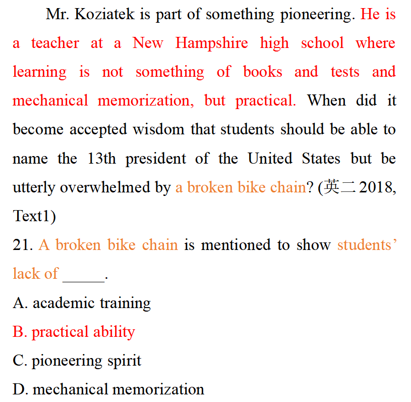 围绕例子往前找,找到观点句:He is a teacher at a New Hampshire high school where learning is not something of books and tests and mechanical memorization, but practical. (观点是作者认为学习不是书本和机械记忆,而应该是实践能力)。
