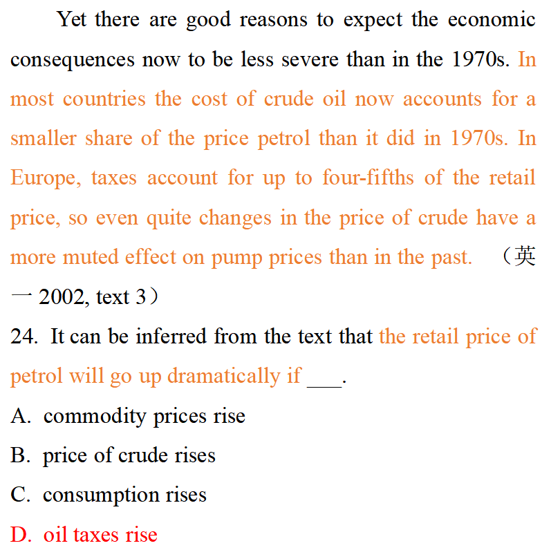 比对选项,确定正确答案。注意审题,同时注意排除过度推论或无关选项。由此可以推知,汽油价位的上升更多的是取决于“税收”,故D正确。
