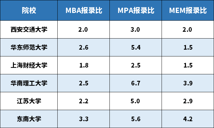 如果再对比这三个专业,报考难度排序是MBA<MEM<MPA。MBA的报录比是最低的,绝大部分院校报录比都低于2。MEM作为MBA的“平替”,是很多追求性价比同学的首选,报录比基本上在2-4之间。MPA这几年随着报考热度的上升,报录比也有所增加,对比MBA报录比要略高一些。