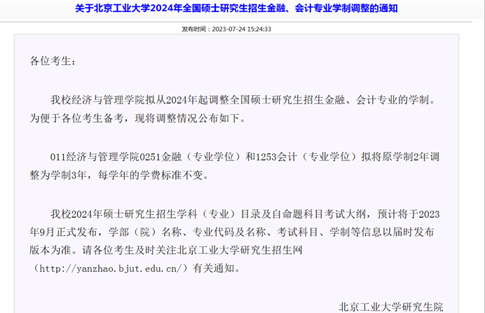 7月24日北京工业大学发布学制调整通知,经济与管理学院0251金融(专业学位)和1253会计(专业学位)拟将原学制2年调整为学制3年。
