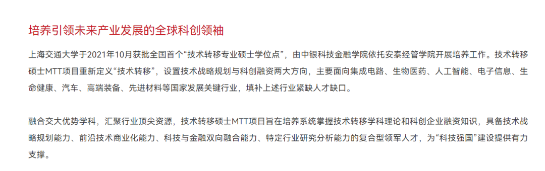 主要面向集成电路、生物医药、人工智能、电子信息、生命健康、汽车、高端装备、先进材料等国家发展关键行业,填补上述行业紧缺人才缺口。对考生背景的要求相对宽泛,只要对技术转移相关领域有浓厚兴趣,或者职业发展规划与技术转移领域契合的,同样欢迎!