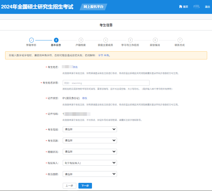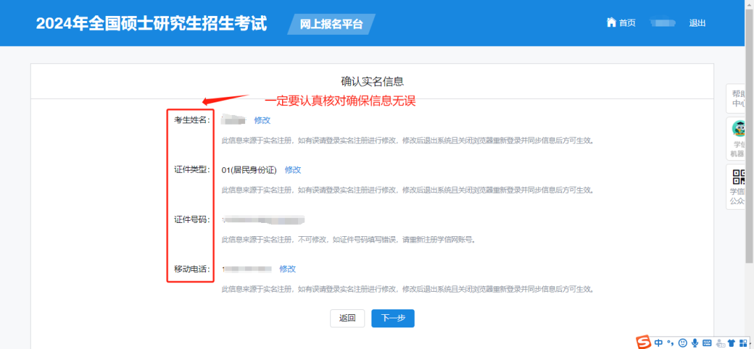 这部分的信息是从学信网实名注册中获取的,如需修改,可点击“修改”返回注册模块进行修改。确认无误就点击“下一步”啦!