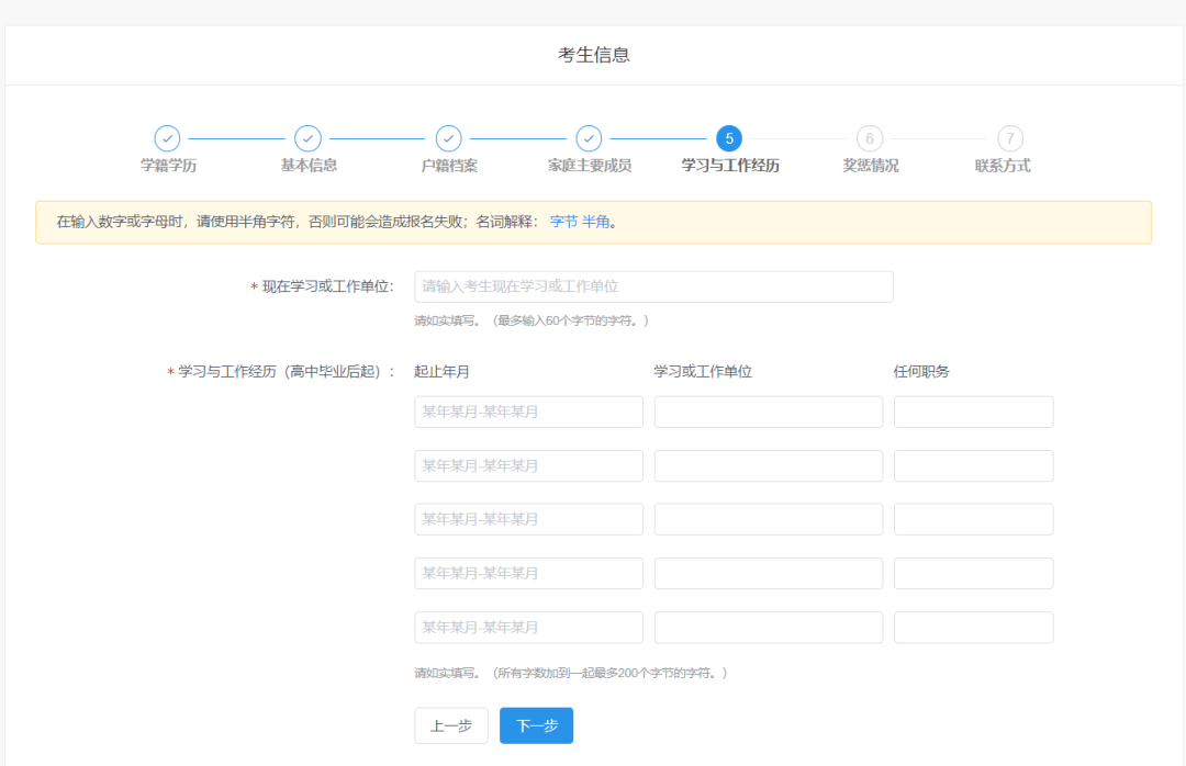 “学习与工作经历”:如实填写即可,注意字符限制,但至少要完整填写一项。