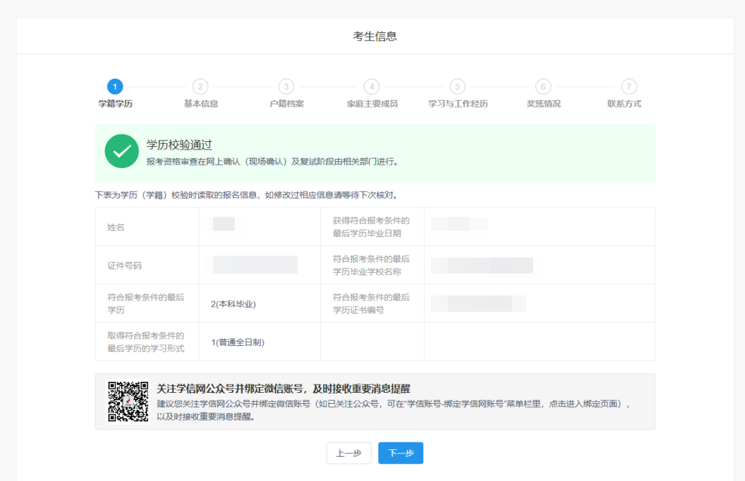如果提示“学历校验未通过”,是因为学历学籍信息输入有误,可返回上一步修改。校验结果不会影响接下来的操作,为了不中断报考流程,可“下一步”继续填写考生信息。不用担心“学历校验未通过”,可以报考完成后,再回来按照提示解决。