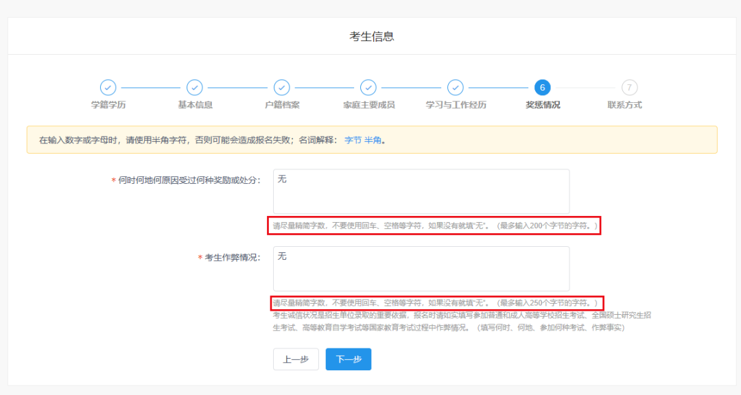 如实填写即可,奖惩情况没有填“无”;有则注意字符限制,超字数无法“下一步”哦!