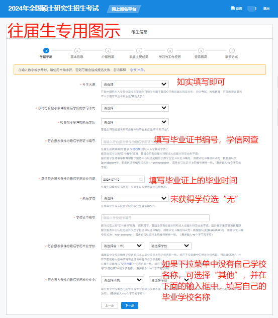 “考生来源”:有工作考生选择“4(其他在职人员)”,暂无工作的考生可选择“7(其他人员)”,以报考院校要求为准,如实填写即可。
