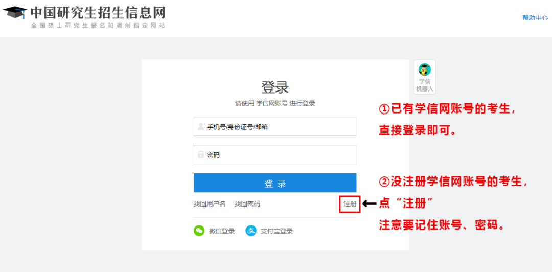 没有注册过学信网账号的同学需要注册新账号,已经注册过的同学用学信网账号直接登录。若忘记账号或密码,可通过相关证件信息找回。(建议微信或支付宝绑定学信网账号,登录更便捷)