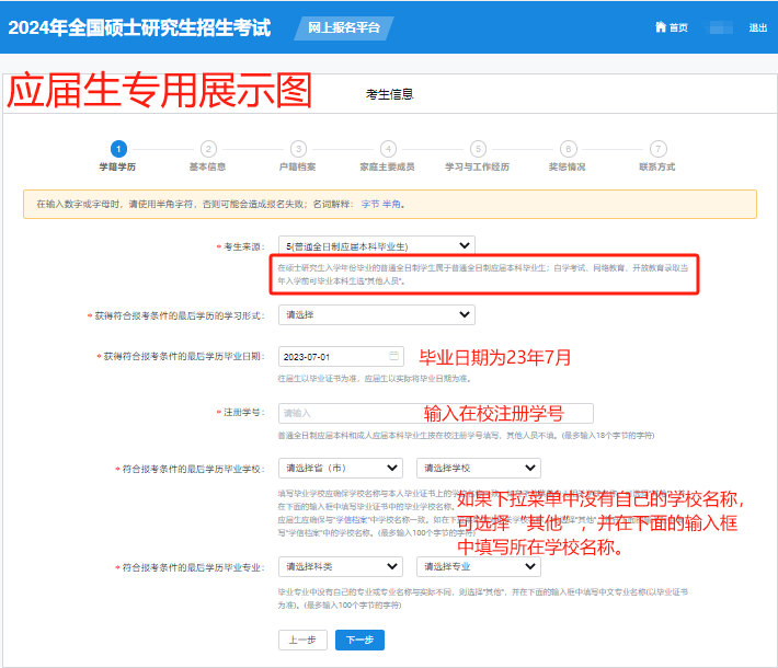 “考生来源”:在硕士研究生入学年份毕业的普通全日制学生选择“5(普通全日制应届本科毕业生)”;自学考试、网络教育、开放教育录取当年入学前可毕业本科生选“7(其他人员)”。