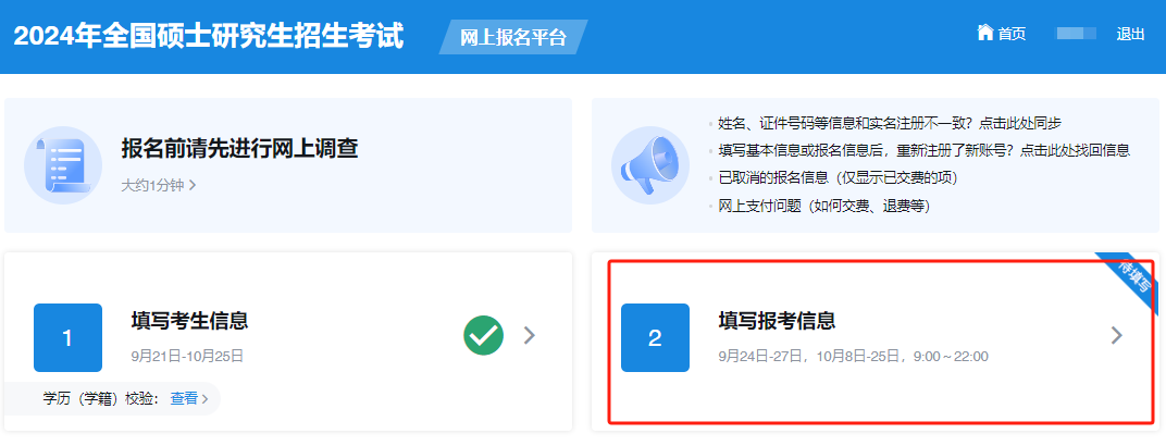 网报分为“填写考生信息”和“填写报考信息”两大步骤,可以分步保存内容。考生信息填写完成后,才能填写报考信息。