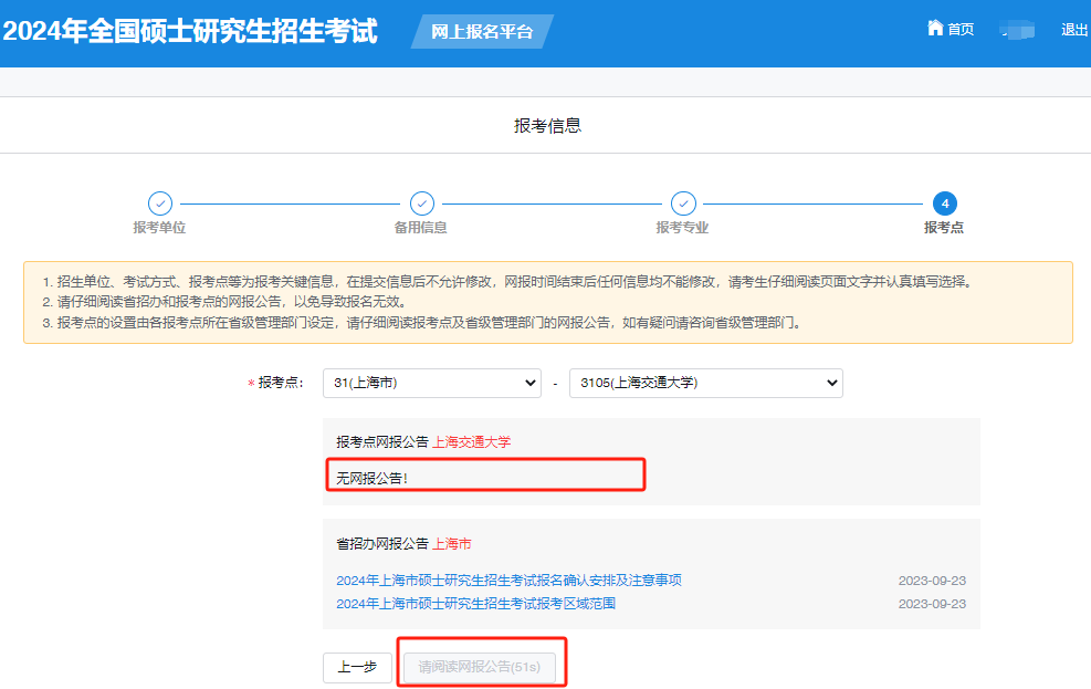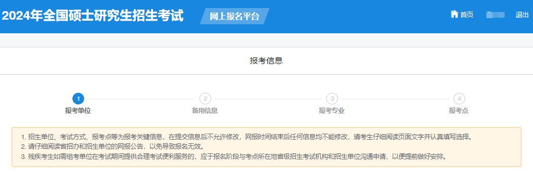 根据报考院校公告填写,谨记“招生单位”、“考试方式”、“报考点”,在提交后无法修改,一旦出错,只能重新新增报名。若发现错误时,已过报考时间,就会耽误考试。所以在填写前一定仔细阅读你所报考学校的网报公告,认真选择,确保无误。