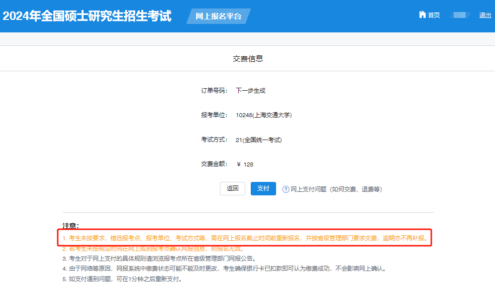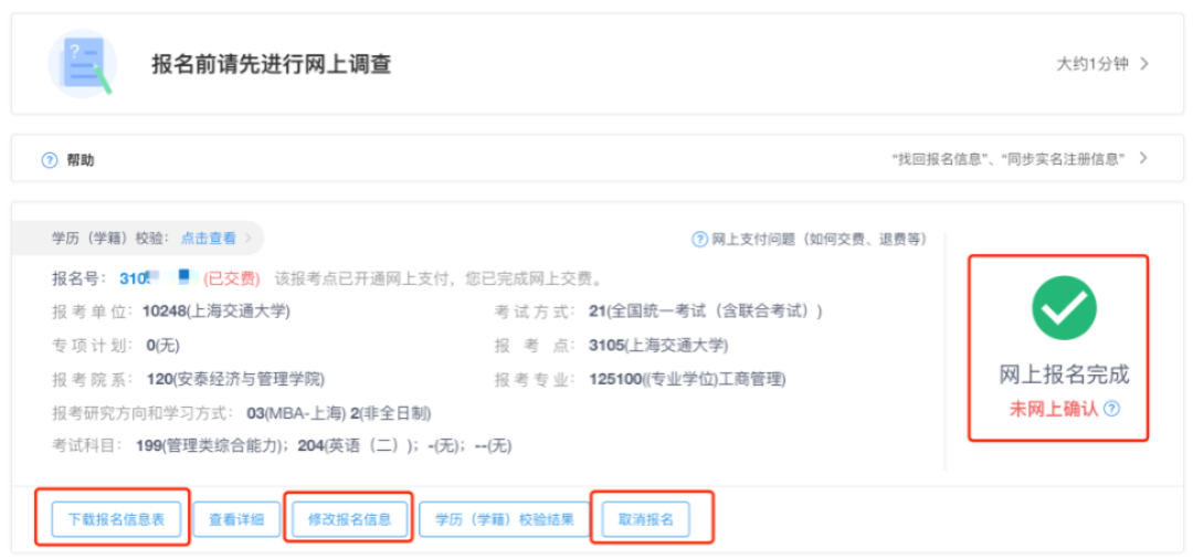 附:在网报结束前,可点击“修改报名信息”修改或查询自己的报名信息。招生单位、考试方式及报考点等信息是不可修改的内容。若错选报考点、报考单位、考试方式等,可在网上报名截止时间前,取消报名,点击“新增报名信息”重新报名交费即可。