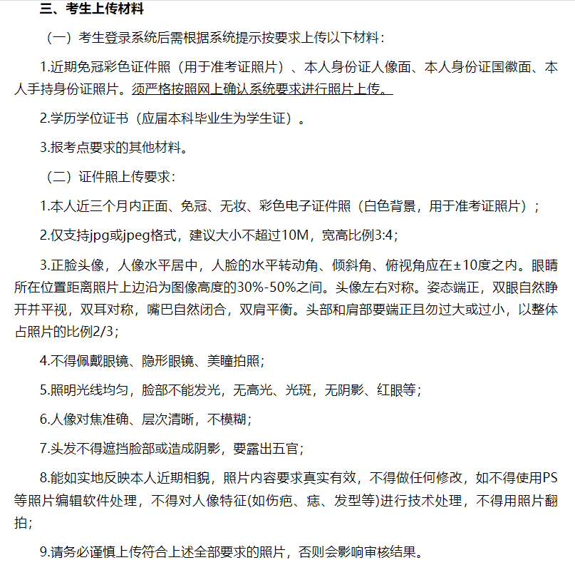 所需材料:严格按照有关要求提交本人照片、居民身份证、学历证书、户籍或社保证明等。报考点将在网上集中审核,并通过网上确认系统向考生反馈审核结果。未能按要求提交材料或提供虚假信息导致审核不通过的,将视为报名无效。