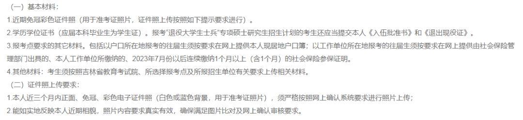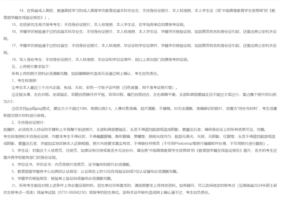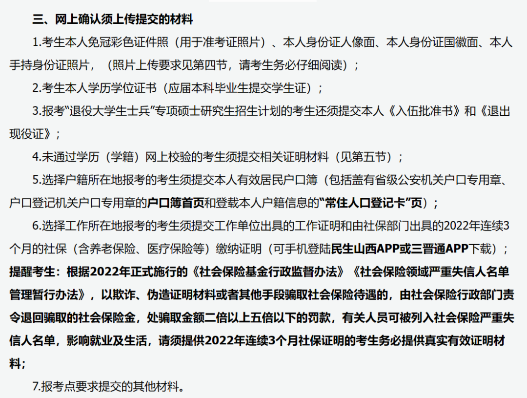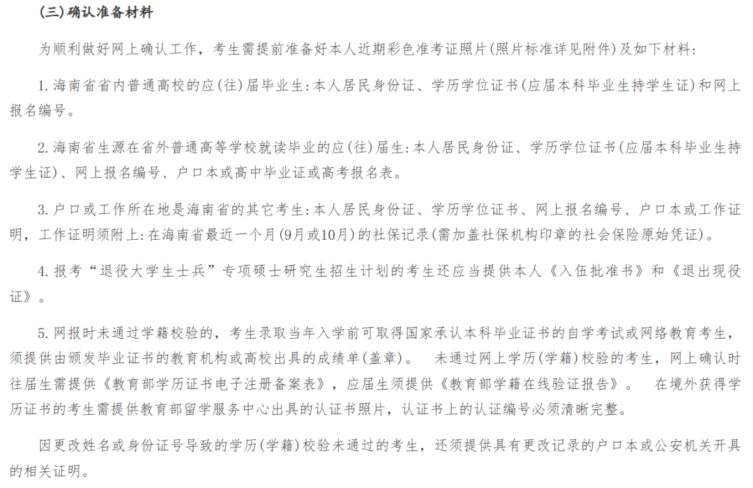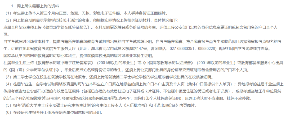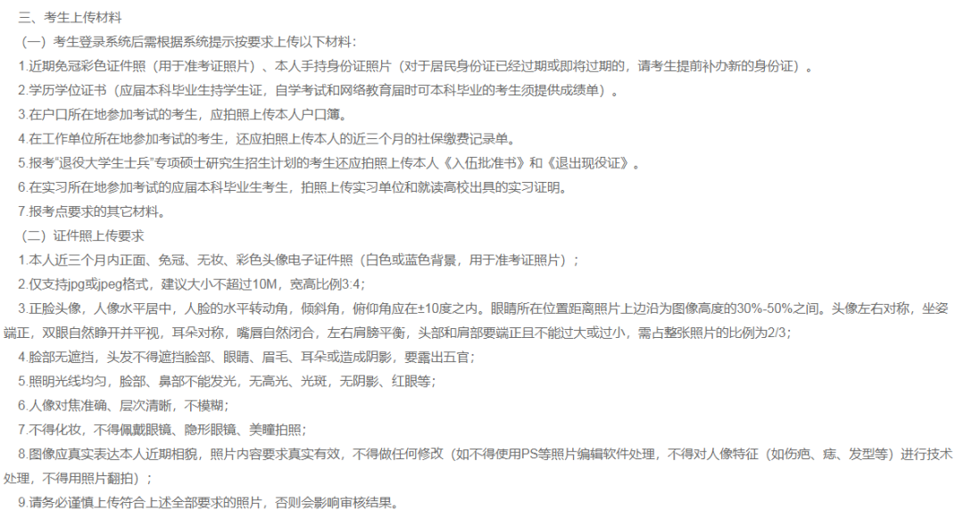 所需材料:考生在网上确认时须按报考点要求及时上传并提交本人图像照片、居民身份证、学历学位证书(应届本科毕业生持学生证)及其他相关材料。报考“退役大学生士兵”专项硕士研究生招生计划的考生还须提交本人《入伍批准书》和《退出现役证》。