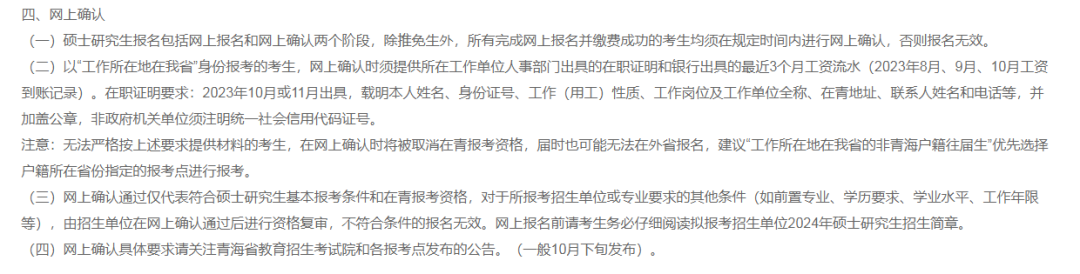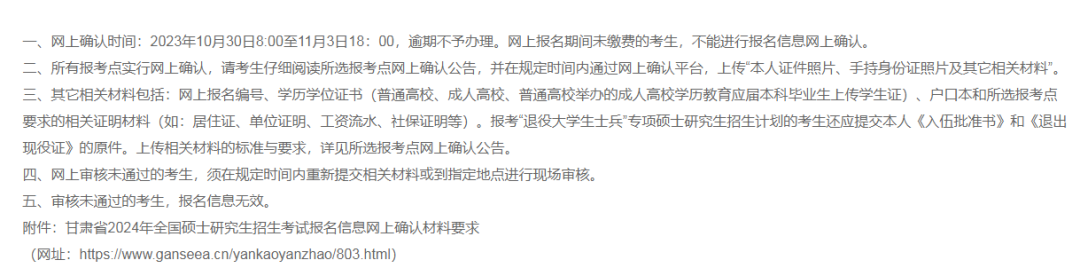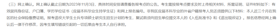确认时间:2023年11月5日前,考生必须按要求完成网报信息确认,逾期不再确认,具体时间、确认方式和要求另行公告。