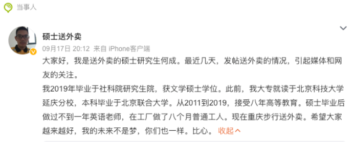 前一阵,一位毕业于中国社会科学院研究生院的硕士研究生送外卖的真实案例,就引发了热议。