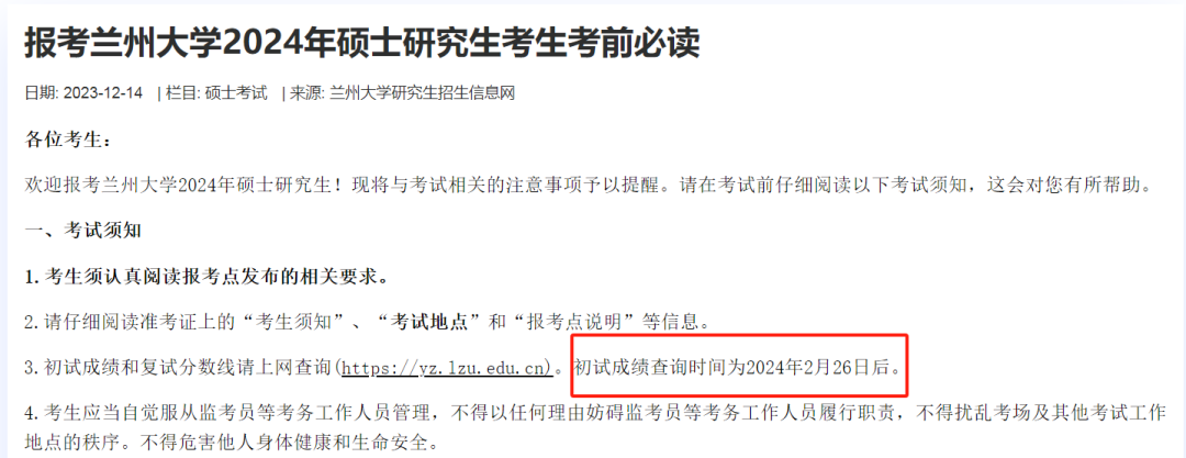 兰州大学公布初试成绩查询时间为2024年2月26日后。