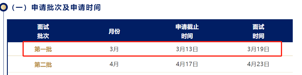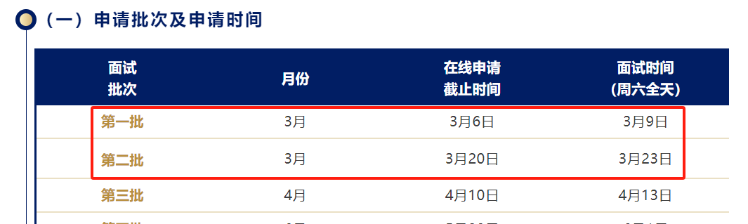 各个院校每年会安排多个批次的提前面试,每个学生只能选择一个批次参加。虽然不同批次的考试内容相同,但是建议参加提前面试要赶早。