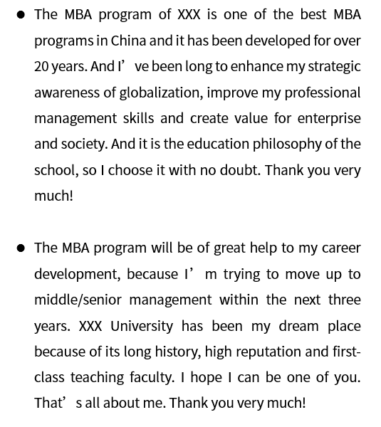 这个部分主要体现自己的报考动机。建议表达一下自己的职业规划、学习诉求和决心以及对学校的理解。同学们如果想要准备更充分,可以查阅面试院校的项目网页,了解学校的办校、办院、办项目的主旨和优势;项目的课程设置,特别是和你工作相关的、你比较感兴趣的2-3个课程。