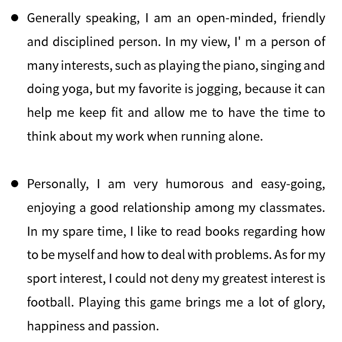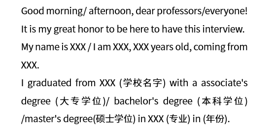 作为英文面试中最常见的考察形式之一,英文自我介绍是一定要提前准备好的。有些学校会在面试政策中明确提到“考生用英文进行自我介绍”;有些学校则会采用问答的形式,其中随机可能包括自我介绍的问题。