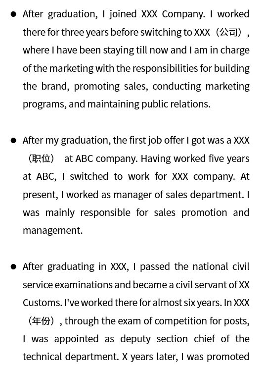 这个部分主要向考官介绍自己的公司、职位、工作内容等。当然,除了基本的工作信息,如果想要脱颖而出,体现亮点,建议突出自己的核心优势以及工作中所取得的成就。