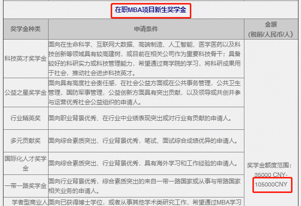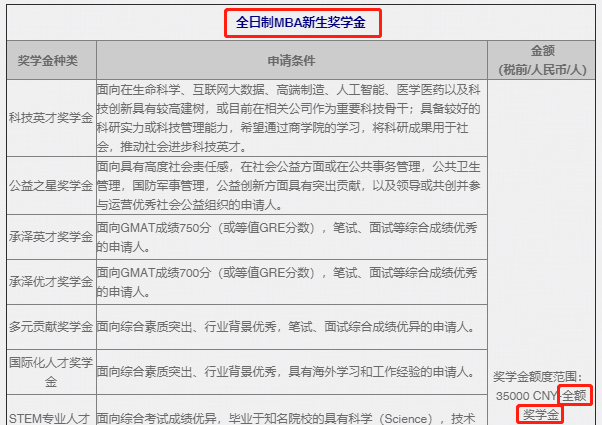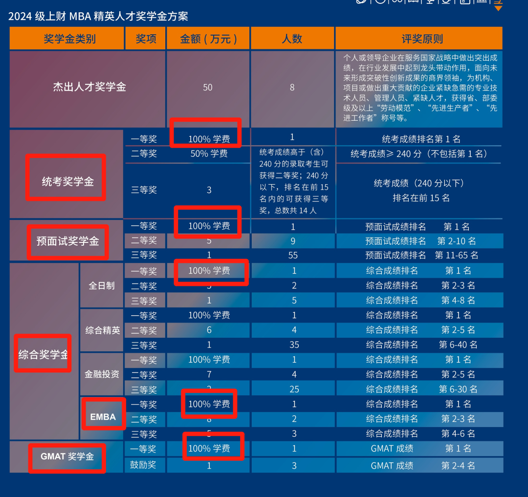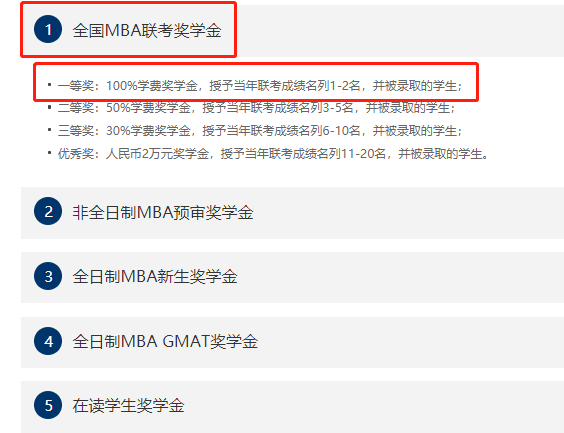 报考MBA的同学,统考成绩排名第一/预面试成绩排名第一/综合成绩排名第一/GMAT成绩排名第一,满足其中任意一项即可获得100%学费的奖学金;