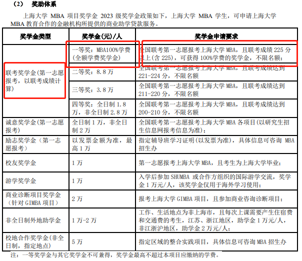 上海大学2023级奖学金政策中表示,以全国联考第一志愿报考上海大学MBA且联考成绩225分(含225),可获得100%学费的奖学金,不限名额。