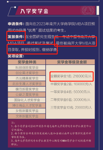南开大学一共设立了10种奖学金,统一使用一个等级及金额分配规则,其中一等奖是21.8万,是南开MBA新年度的学费,也是100%覆盖。