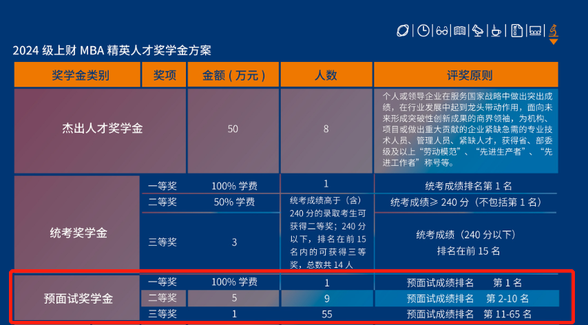 MBA院校学费很贵,部分高校设置了提前面试奖学金,奖励提面成绩优秀的考生,如果参加提前面试并且拿到比较好的成绩,能节省一部分学费!