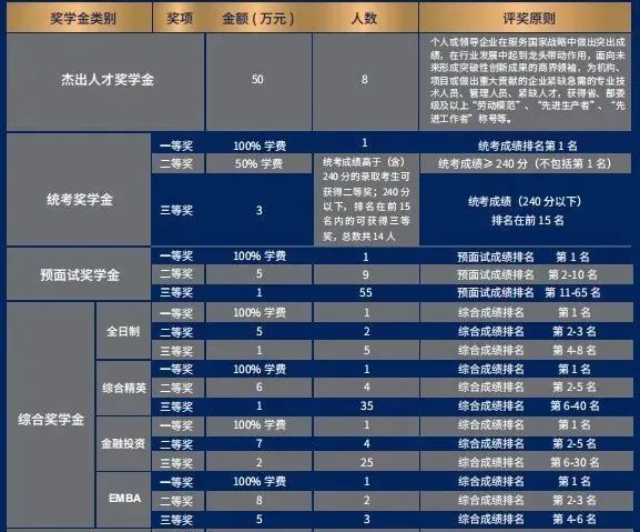 例如上海财经大学设置预面试奖学金,针对预面试成绩排第1名的奖励100%学费;第2-10名有5万元的奖金;第11-65名有1万元的奖金。