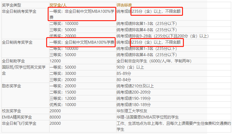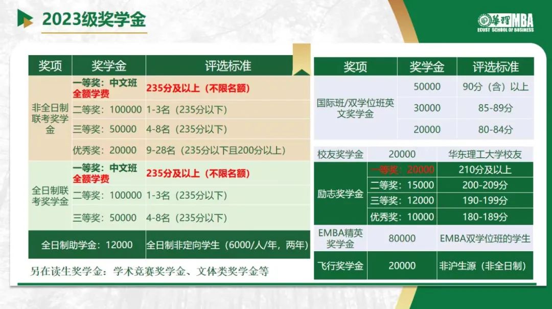 如华东理工大学2023级奖学金政策中明确表示,非全日制/全日制统考成绩235分(含)以上,均可获得中文班100%学费的奖学金。所以想报华理的同学,冲击高分就是在赚钱啦!