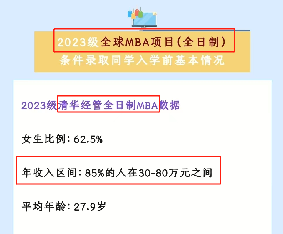 比如清华大学经济管理学院全球MBA项目,学费是19.8万,19.8的1.5倍就是29.7万,而该项目新生年收入在30万以上的占85%。