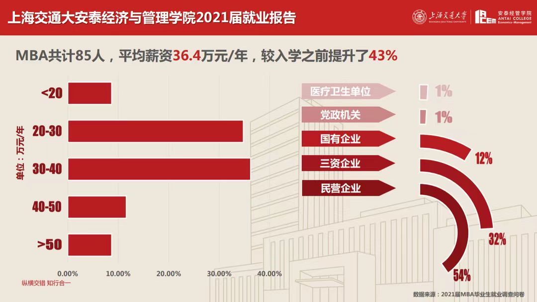 上海交大安泰MBA21届毕业生平均年薪36.4万,较入学前提升43%,也就是说入学前的薪资是25.45 万。