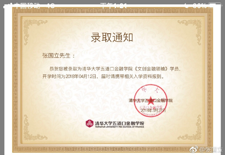 原来,他被清华大学五道口金融学院的金融EMBA录取,只不过不是以我们熟知的演员或者是主持人的身份入学,而是以影视公司老总的身份。