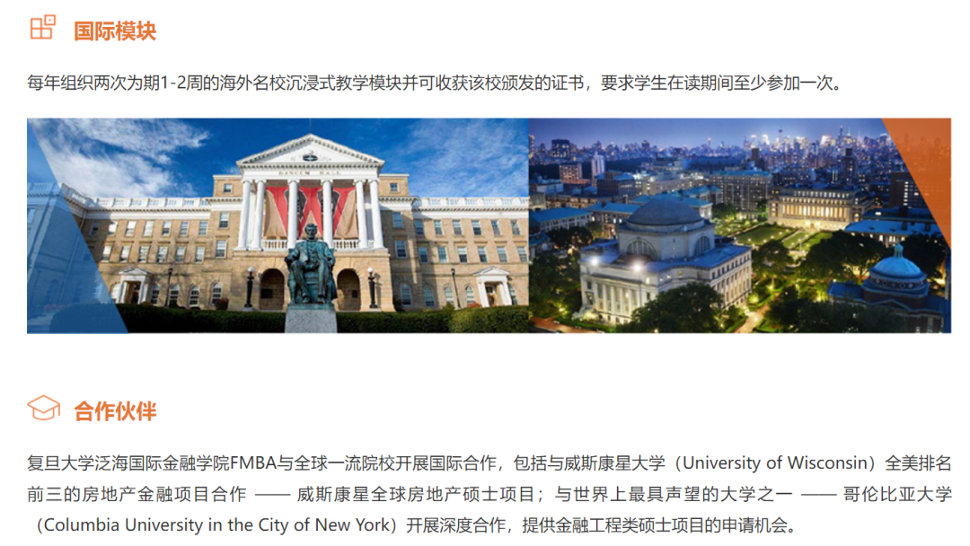 在国际合作上,清北复交等名校会和MIT、康奈尔、新加坡国立等乃至多个世界顶尖的院校合作,比如复旦泛海国际金融学院的在职金融MBA,每年都会组织两次为期1-2周的海外名校沉浸式教学。