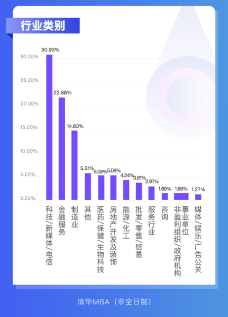 目前来说,报考MBA的申请者还是以金融行服务行业为主,近几年像互联网、IT、科技、新媒体等新兴行业的兴起,使得越来越多相关行业的从业人员选择报考MBA来提升自己的管理能力和综合素养。